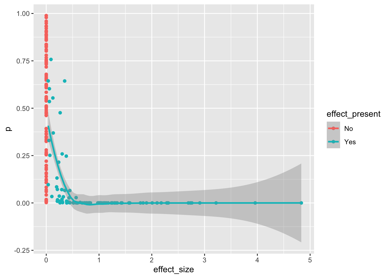 dat ggplot(aes(effect_size, p, colour = effect_present)) +